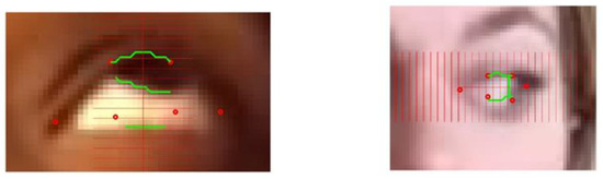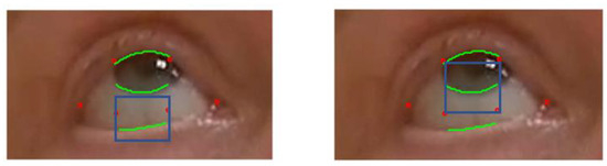 Local Rectangle on left to search for the correct position of the lower lid and on right to draw the interface between the iris and sclera below. The red dots are obtained with the machine learning method. The blue squares are the regions used to search for the green landmarks: the iris boundary and the upper and lower eyelids.