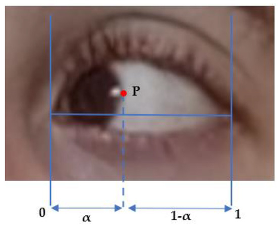 As illustrated in Figure 2, we use a similar method to identify the upper lid and lower lid position. The only novelty here is to identify the correct side boundary of the iris as the patient is looking left or right, using a computer vision algorithm in a small horizontal box that starts from the corner of the eye landmark (37) or (40) and goes to the landmarks of the upper lid and lower lid on the opposite side, i.e., (39) and (41) or (38) and (42). The same algorithm is applied to the right eye, as described above, and the left eye, except that the inteface is now crossing the rectangle of interest vertically. We compute the barycentric coordinate denoted α and the horizontal distance of the point P that is the visible lateral point of the iris boundary to the corner of the eye, relative to eye length, as shown in Figure 2 and Figure 8. We denote these as αleft and αright the measurement α for the left and right eyes, respectively. The distance from the face of the patient to the camera is much larger than the dimension of the eye and makes the barycentric coordinate quasi-invariant to the small motion of the patient head during the exercise.