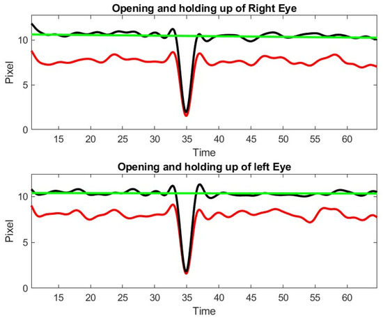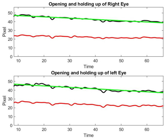 Linear least square fitting coefficient of the upper lid drop from right and left eye, respectively = [−0.15, −0.17]. The green line shows a least square approximation of the distance between the lower lid and upper lids of the patient. The red curve shows the distance between the lower point of the iris and the lower lid below. This second curve is used to check that the patient performs the exercise correctly.