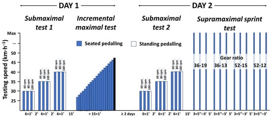 On day 1, this test was performed following the submaximal test, after a recovery period of 15 min. The initial testing speed was set at 27 km·h−1, increasing by 1 km·h−1 every minute until the cyclist was not able to maintain the speed []. The gear ratio was freely chosen by the cyclists, and they were asked to maintain a cadence between 85 and 100 rpm and to remain seated at all times during the test. Data from the entire minute was used for the analysis, and the display of the cyclosimulator (Cateye CS-1000) was used as visual reference for the cyclists to adapt to the testing speed.