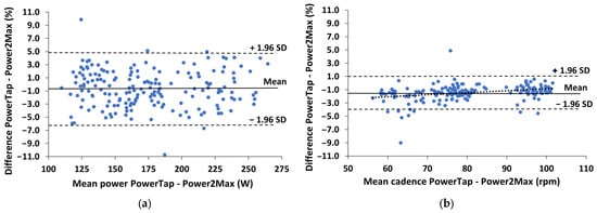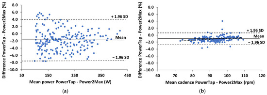 Figure 3 shows the Bland–Altman plots of the percentual differences in both power and cadence measurements between the two powermeters during the incremental maximal test. The power differences were constant (r = −0.01 and p > 0.05), while the cadence differences decreased as cadence increased (r = 0.32 and p < 0.001).