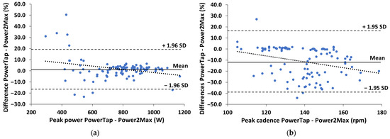 Figure 4 shows the Bland–Altman plots of the percentual differences in both peak power and peak cadence measurements between the two powermeters during the supramaximal sprint test. Power and cadence differences increased as cadence increased (r = −0.34 and −0.37, respectively; p < 0.001).