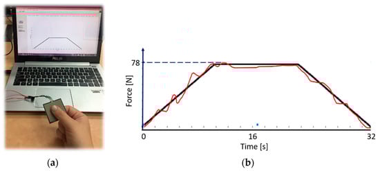 We used a system for evaluating the modulation of the lateral pinch force. We chose the physical measure of force modulation, since conventional evaluation, e.g., grip force, provides a singular measurement that can be accurately evaluated, as it produces a final value of measurement. The system (Figure 1a) consists of a 3.8 × 3.8 cm square sensor (Interlink electronics, Irvine, CA, USA), which measures force between 0.981 N and 98.1 N. Virtual feedback is provided on screen on which a red graph is displayed, the height of which is controlled by the amount of force applied by the participant. The participant is asked to follow the fixed trajectory of a ramp while the red force line is moving from left to right, so that it reaches the end of the ramp in 32 s (Figure 1b).