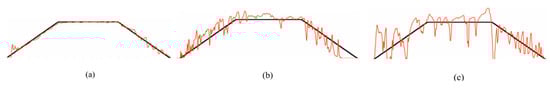Digital recording of the lateral pinch modulation tests: (a) good force modulation (normalized score = 1.6), (b) moderate force modulation (normalized score = 4.6), (c) bad force modulation (normalized score = 9.0). A black constant ramp line serves as the pattern for the red line tracing. The red line is moving from left to right so that it reaches the end of the ramp in 32 s. The amount of actual force applied is not shown during assessment, to prevent further bias by the assessors.