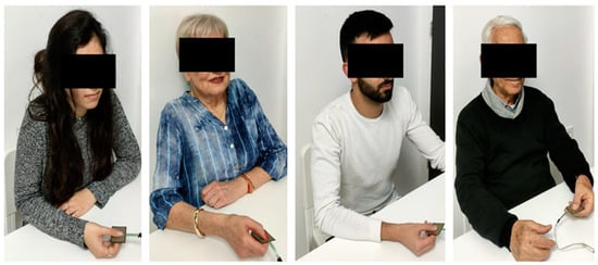 Examples of videos showing patients holding the force sensors. From left to right: young female, old female, young male, old male. The subjects were shown these videos without the eye masking.