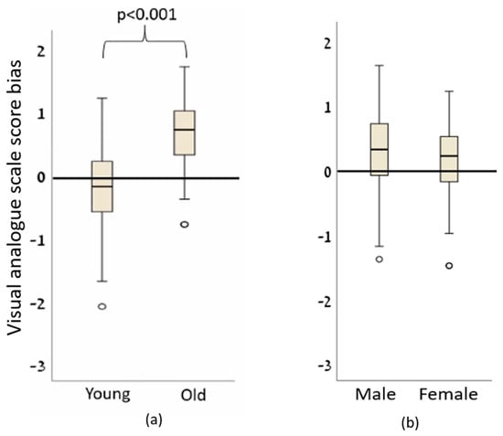 The bias of the subjects’ assessment of the performance of (a) old and young people and (b) female and male. A score of ‘0’ means no bias. A positive score means that the performance was estimated to be worse than it actually was (the subject gave a higher normalized score than the actual calculated score), while a negative score means that the performance was estimated to be better than the actual performance.