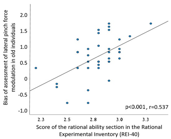 A significant positive correlation between the score of the rational ability section in the REI-40 and the cognitive bias of assessment of lateral pinch force modulation in old individuals.