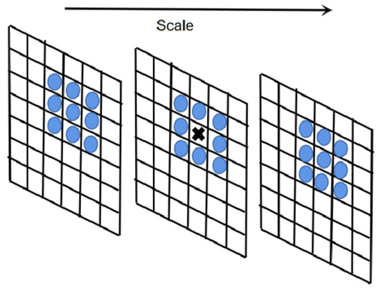 In order to obtain the feature points that can be used for feature matching in , the interest points need to be screened. At the neighborhood of each interest point, we use a filter of size to perform non-extreme value suppression: We compare each interest point with pixels in its scale space and 2D image space neighborhood. If it is not a maximum value or a minimum value, it will be eliminated, and the remaining key points will be saved as feature points. Figure 1 is a schematic diagram of non-extreme value suppression, assuming . The interest points marked as × are compared to the surrounding 26 interest points marked as O to eliminate non-extremum points.