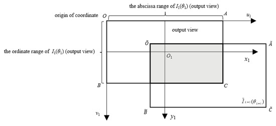 Due to the transformation calculations, the resulting pixel coordinates of cause a change in the position of the image within its imaging plane. Additionally, each frame image has a different imaging plane coordinate system, resulting in variations in the imaging standards across the images. To address this issue, this paper adopts the imaging plane coordinate system of the first frame image as the output view’s imaging plane coordinate system. The pixel coordinate range of is also used as the pixel range of the output view, as shown in Figure 4. The image is transformed using the inverse affine transformation in relation to this output view, resulting in the globally motion-compensated image .