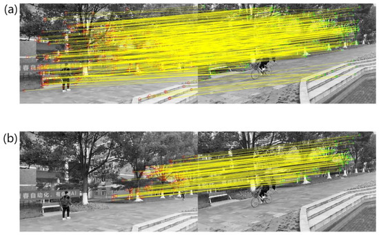In Figure 5, there are a total of 1103 feature point matches and 619 inlier point matches between the first frame and the 200th frame of . In Figure 6, there are 593 feature point matches and 155 inlier point matches between the first frame and the 200th frame of . It can be observed that the number of inlier points is significantly lower compared to the total number of feature points. This indicates that a portion of feature points that are not suitable for fitting the motion model has been eliminated.