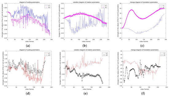 In Figure 7a,d, the scaling changes in the video sequences are reflected, b and e depict the rotation variations, while c and f illustrate the translation changes. Each of the six plots demonstrates different degrees of background motion variations, providing a comprehensive motion estimation analysis for the two video sequences. The motion estimation results reveal that both video sequences, and , exhibit background motion consisting of scaling, rotation, and translation transformations, without following any specific pattern or regularity.