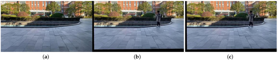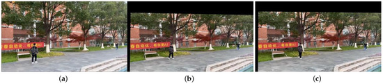 From Figure 8 and Figure 9, it can be observed that due to the presence of global motion in and , different frames capture slightly different scenes. After applying the proposed algorithm for global motion compensation, there may be pixels that fall outside the view boundaries or do not satisfy the output view criteria. These pixels result in varying degrees of black borders, as expected in the compensated images.