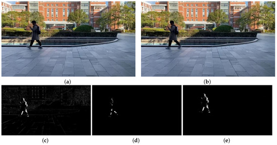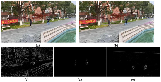 In comparison to the sequence, the sequence has more background motion, which leads to stronger interference in the direct frame difference result. In Figure 11c, the objects and the background are merged together, making it difficult to distinguish the moving objects. In Figure 11d, the result obtained using the traditional algorithm, there are more noise points and the edges of the objects are not clear. However, in Figure 11e, the result obtained using the algorithm proposed in the paper, the interference from the global motion is significantly reduced, and the moving objects are clearly detected.
