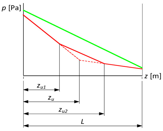 After the occurrence of a leakage at a point with coordinate situated in the i-th segment of the pipeline, the flow distribution takes the form presented in Figure 3. For comparison, Figure 4 presents such distribution corresponding to the identical pipeline’s operation but considered from the perspective of the consecutively measured pressures along the pipeline. Then, accordingly to relationship (15), the volume flow rate in the i-th segment of the pipeline takes an intermediate value between the pipeline’s inbound flow rate and outbound flow rate .