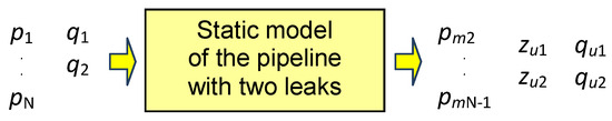 The proposed solution makes use of a static liquid flow model to describe a pipeline with a leak event at two distinct locations. This approach assumes that measurements of the pressure and flow volume are served as the boundary conditions for solving the model, whereas the drop leak locations are used as parameters. Then, the pressure values corresponding to pressure measurement points , …, and the parameters of both leaks are established as the model outputs (see Figure 2).