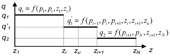 Distribution of volume flow rate q based on pressure measurements in the pipeline with a leak of coordinate zu in the i-th sensor’s segment.
