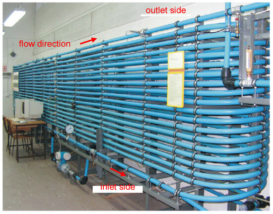The laboratory pipeline is nearly 400 m in length, including the main pipe segment (Figure 5), which is 380 m long, with appointed inlet coordinate and outlet coordinate . This section is built of polyethylene tubes (HDPE) with an internal diameter of 34 mm and an external diameter of 40 mm.