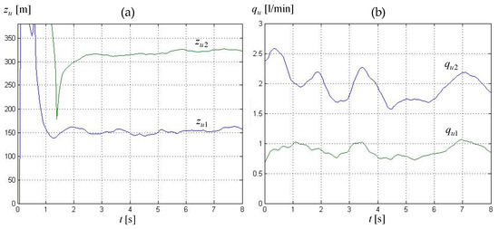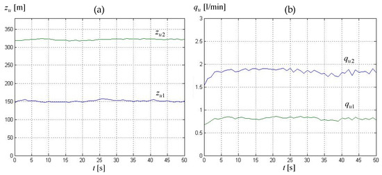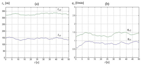 Leak parameters in transient state obtained using Method II and data for experiment 1 (‘0’ on the time axis corresponds to the 180-th second of experiment data recording): (a) leak locations zu1, zu2, (b) leak intensity qu1, qu2.
