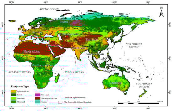 The study area is vast and the ecosystem is complex with frequent changes in the ecological environment. The topography of the region is complex, including the world’s highest mountain in the Himalayas, as well as the Kunlun Mountains, Hindu Kush Mountains and other majestic mountains. It also includes the world’s highest Qinghai–Tibet Plateau, the Pamirs Plateau, the Iranian Plateau, the fertile plains and deltas of North China, the Ganges River and Eastern Europe. The climate differences are large, including tropical, temperate and cold zones which cross into a monsoon climate, continental climate and desert climate. It covers five climatic zones including a dry climatic zone, equatorial climatic zone, warm temperate climatic zone, cold temperate climatic zone and polar climatic zone [2,3]. It has rich vegetation and ecological resources owing to its large geographical span and differences in climate.