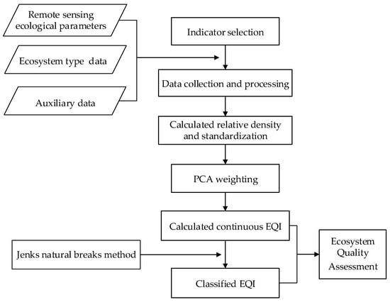 Figure 2 presents a flowchart of ecosystem quality assessments over the B&R region. Firstly, the indicators for ecosystem quality assessment were selected following scientificity and operability. Then, the relative density of each indicator was calculated and their weights were estimated using the principle component analysis (PCA) method, an objective weighting approach based on the intrinsic characteristics of data rather than subjective opinions from experts. Finally, an ecosystem quality index (EQI) was calculated and classified into five categorizes by the Jenks natural breaks method to provide a generalized understanding of the degree of ecosystem quality across the B&R region.