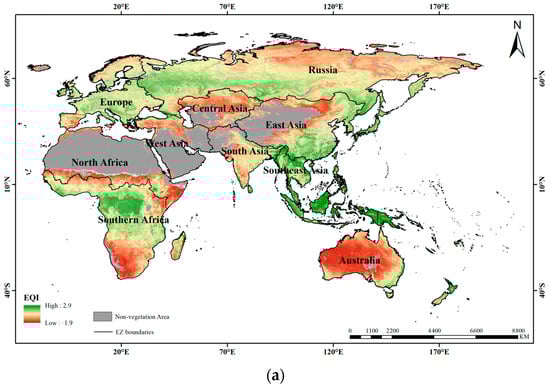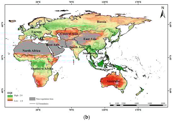 The overall ecosystem quality level of the B&R region can be considered as “low”, since this designation accounts for the largest area proportions for almost 30% ofthe study period. The spatial distributions of EQI in the B&R region are in accordance with the distribution of vegetation ecosystem types and non-vegetation areas, especially the desert ecosystem, and they present an irregular pattern for the entire B&R region. The areas with the lowest EQIs are mainly distributed in Australia, south of Southern Africa, the junction between Southern Africa and North Africa, north of West Asia, north of Central Asia, and northwest of East Asia, which indicates that the ecosystem quality of those areas is poor. These areas are consistent with the ecological restoration project implemented in regions or countries summarized by the FAO [34]. They are mainly located around arid and semi-arid areas, which belong to a semi-desert climate with little precipitation throughout the year [35]. The annual precipitation in these areas is generally less than 250 mm. In addition, the large daily temperature range, accompanied by frequent sand activity, can lead to a bare and sparse vegetation ecosystem with the lowest coverage and productivity. Northeast Russia has the lowest EQI and is located in the Arctic Circle, belonging to the cold tundra climate. The altitude and climate conditions result in scarce precipitation and weak solar radiation. The vegetation ecosystem is mainly sparse tundra with lower coverage and productivity [36]. The zones including Southeast Asia, east of East Asia, central of Southern Africa, southwest of Russia and south of Europe have the highest EQIs. The regions south of Southeast Asia and central of Southern Africa have a tropical rainforest climate, and those north of Southeast Asia and east of East Asia belong to a tropical monsoon climate. These climatic conditions make the areas suitable for vegetation growth and production, leading to an excellent ecosystem quality. Southwest Russia is located in a cold temperate zone with insufficient heat, but the snowfall is very rich. Therefore, a large area of cold evergreen coniferous forest has been developed, leading to a rich annual cumulative productivity. As for south of Europe, the warm and humid air from the Atlantic can penetrate into the inland, bringing in a warm climate and relatively high precipitation of more than 1000 mm. Moreover, the climate conditions boost vegetation growth and production, leading to a better ecological environment.