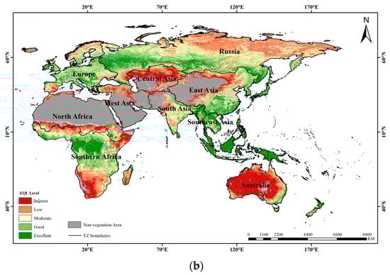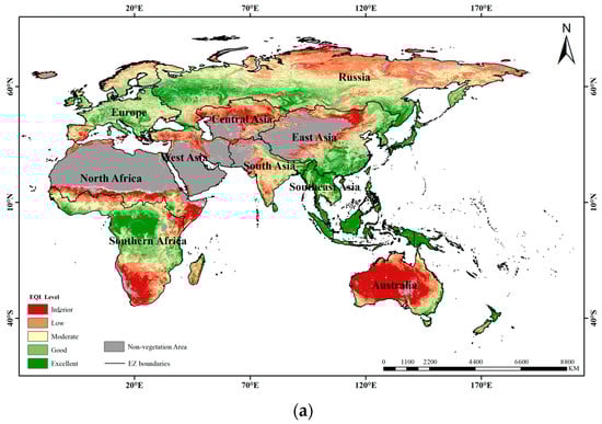 The distributions of the continuous EQIs and EQI levels are presented in Figure 3 and Figure 4, respectively. EQI values varied from −1.9 to 2.9 in the year 2016 and from −1.9 to 2.8 in the year 2020, with the higher values indicating the better ecosystem quality of the study area throughout the study period. Generally, the spatial distributions of the EQI values were similar in the years 2016 and 2020, with irregular distributions. The lowest EQI values mainly appeared in Australia and south of Southern Africa. This may have been caused by the vegetation covers of those regions with sparse shrubland and grassland, which have low vitality and productivity. The lower EQI values were mainly distributed in the south of North Africa, north of West Asia, north of Central Asia, northwest of South Asia and northwest of East Asia. The reason may be that those areas are mainly located around deserts and wastelands with low vegetation coverage and low productivity. Moreover, low EQI values also appeared for the northeast of Russia, which may be a result of the low vegetation coverage with tundra located at low altitudes and severe climate conditions.