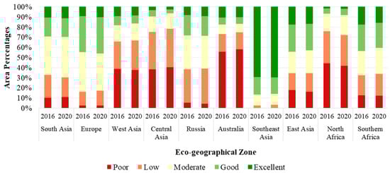 Figure 5 shows the proportions of EQI levels in the 10 eco-geographical zones of the B&R region in the years 2016 and 2020. In the study period, the proportions of the EQI levels in the 10 eco-geographical zones showed stable variations. The results showed that regions with the “low” level occupied the largest proportion with almost 30% whereas regions with “moderate”, “low”, and “poor” levels accounted for more than 70% of the entire study area. In addition, the regions with the proportions of “moderate”, “low” and “poor” levels exceeding 80% were distributed in Central Asia, North Africa, Australia and West Asia, while the regions with the proportions of “excellent” and “good” levels exceeding 80% were distributed in Southeast Asia only. This indicates that the ecosystem quality of the B&R region was relatively low and the EQI level across the B&R region can be defined as “low”. This also indicates that the regional development of ecosystem quality was unbalanced over the B&R region. Therefore, actions should be taken to improve the ecosystem quality of the B&R region, especially for the eco-geographical zones of Central Asia, North Africa, Australia and West Asia, which should pay more attention to the protection of the ecological environment for their more deteriorated ecosystem quality.