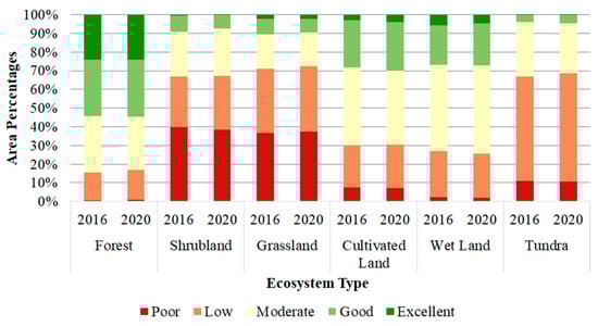 Percentages of EQI levels in the six ecosystem types in 2016 and 2020.