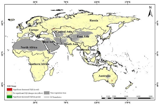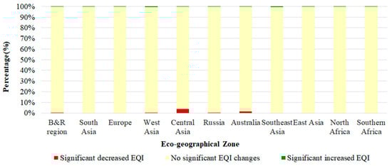 Figure 8 shows the percentages of EQI changes in the 10 eco-geographical zones of the entire study area from 2016 to 2020. Combined with Figure 7, it can be concluded that regions with significantly decreased EQIs occupied 0.45% of the total area, mostly distributed north and central of Central Asia, southeast and central of Russia, southeast and southwest of Australia, and north of West Asia. Central Asia suffered the most serious deterioration in ecosystem quality, accounting for 0.15% of the total study area. This is in accordance with the review of ecological environment patterns across the B&R region performed by Zhang et al., which indicated that vegetation ecological factors will cause obvious zonal and gradient reduction on a scale of a few decades to a hundred years [11]. Generally, Central Asia has a temperate continental climate with scarce precipitation and widespread desert grassland, which makes the ecosystem quality of Central Asia poorer. However, regions with a significantly increased EQI occupied 0.22% and the regions with no significant EQI changes occupied 99.33% of the entire study area, which indicates that most of the B&R regions showed no significant change from the years 2016 to 2020.