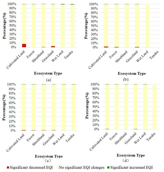 Percentages of each ecosystem type area with different EQI changes from 2016 to 2020 in the four eco-geographical zones with a significantly decreased EQI: (a) Central Asia, (b) Australia, (c) Russia, (d) West Asia.