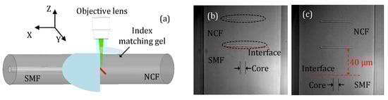 A section of NCF (FG125LA, THORLABS, Newton, MA, USA) made of silica was first connected to an SMF (SMF-28, Corning, Corning, NY, USA) using a fusion splicer (Fujikura 70s, Japan). The diameter of the NCF was 125 μm, which matched well with that of a standard SMF. The hybrid fiber structure (i.e., SMF-NCF) was then secured to the workstation for fs-laser irradiation. Figure 1 includes a schematic diagram of the fabrication process and microscope images of the fabricated device samples. In the fabrication, the optical fiber was translated along the Y-direction (as indicated in Figure 1a) at a constant velocity of 10 μm/s. The repetition rate of the laser was reduced to 5 kHz by means of the laser internal pulse picker. The energy of a single laser pulse delivered to the optical fiber was approximately 600 nJ. As can be seen in Figure 1b, two reflectors (marked in the dashed oval) were fabricated in the NCF with a distance of ~40 μm. In this way, an FPI was constructed. The lengths of the two reflectors were ~50 μm. The first reflector (the lower one) was very close to the fusion splicing interface between the SMF and the NCF, i.e., a 2 μm offset. Figure 1c presents a microscope image of another device sample where the first reflector was ~40 μm above the fusion splicing interface, i.e., a 40 μm offset. Owing to the high transmission loss of the NCF, we expect that the device sample shown in Figure 1b would have a better signal quality than the device sample shown in Figure 1c. Note that the free end of the NCF was broken to avoid additional reflection.