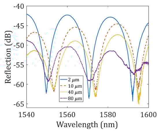The fabricated device samples were characterized using a broadband source (Thorlabs ASE-FL7002-C4, 1530–1610 nm) and an optical spectrum analyzer (ANDO AQ6317B, Japan). Figure 2 presents the measured reflection spectra of several device samples; the difference between these device samples is the offset distance of the first reflector to the fusion splicing interface, i.e., 2 μm (shown in Figure 1b), 10 μm, 40 μm (shown in Figure 1c), and 80 μm. The FSR for all the reflection spectra shown in Figure 2 was found to be approximately 21 nm, which matched well with the theoretical value. For the 2 μm-offset device sample, the fringe visibility of the interference pattern was found to be >20 dB; as the offset distance increased to 10 μm, 40 μm, and 80 μm, the fringe visibility decreased to ~15 dB, ~13 dB, and ~10 dB, respectively. The total reflectivity of the FPI also decreased as the offset distance increased. A modulation envelope could also be observed in the reflection spectra, which was due to the additional reflections that occurred at the two boundaries of the first reflector (the reflector has a thickness of ~2.5 μm).