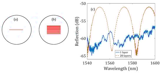 Demonstration of using multi-layer line reflectors for reflectivity enhancement. Illustration of the (a) 1-layer line reflector and (b) 20-layer line reflector. (c) Reflection spectra of the NCF-FPIs with two 1-layer line reflectors and two 20-layer line reflectors. The offset distance of the first reflector in the two NCF-FPIs to the fusion splicing interface was 120 μm.