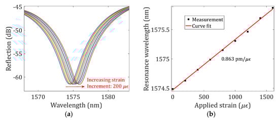 To verify their functionality, the strain responses of the NCF-FPI (the device sample with a 10 μm offset and two 1-layer line reflectors as given in Figure 2) were first characterized at room temperature. The sensor device was centered between two translation stages (OMTOOLS, HFA-XYZ, Wuhan, China) fixed on an optical table with a separation distance of 150 mm. One stage was forced outwards to elongate the secured optical fiber section in increments of 30 μm, thus applying strains in increments of 200 microstrains (με) to the sensor device along the axial direction. Figure 4 presents the investigation results. The evolution of the reflection spectrum at around 1575 nm for different settings of applied strain is shown in Figure 4a. A low-pass filter was applied to the recorded spectra. The reflection spectrum shifted to the long-wavelength region as the applied strain increased, as can be expected based on Equation (2). Figure 4b shows the dip wavelength as a function of the applied tensile strain. A linear curve fit was applied to the measured datasets; the slope, i.e., the strain measurement sensitivity, was determined to be 0.863 pm/με with an R-squared of 0.9978.