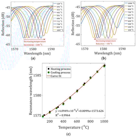 The temperature responses of the NCF-FPI (the device sample with 10 μm offset and 1-layer reflectors) were tested by placing the sensor device in a tubular furnace (Lindberg BLUE M, Thermal SCIENTIFIC, Waltham, MA, USA). The temperature in the furnace was increased from 100 to 1000 °C in increments of 100 °C and subsequently decreased to 100 °C with an average ramp rate of ~20 °C/min. The recorded reflection spectra of the sensor for different temperature settings in the processes of increasing and decreasing temperature are plotted in Figure 5a,b, respectively. The spectra were filtered using a low-pass filter. The spectrum shifted to the long-wavelength region as the temperature increased and recovered as the temperature decreased. Figure 5c shows the measured resonance wavelengths as a function of temperatures during the heating and cooling processes. The responses of the sensor in the heating processes and cooling processes matched well. A second-order polynomial curve fit was applied to the measured datasets; the fitting results are included in Figure 5c. Alternatively, by dividing the temperature range into two separate regions, i.e., 100–400 °C and 400–1000 °C, linear curve fits can also be applied. The slopes at 100–400 °C and 400–1000 °C were determined to be 9.865 pm/°C and 15.95 pm/°C with R-squared of 0.9993 and 0.9988, respectively. The obtained temperature sensitivities of the NCF-FPI matched well with previously reported values of SMF-FPIs [,,].