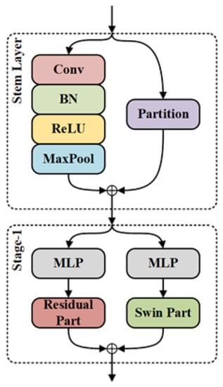 In the initial stage of ResSwinT, the image will generate a feature through the stem layer containing a partition and a convolutional layer. The input image X in the partition is divided into patches of size and flattened to obtain . The stem layer contains convolution and max-pooling with a stride of 2, and its output is . So the calculation process is