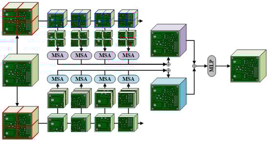 Due to the large amount of computation involved in the global spatial attention, is firstly partitioned according to the size of to obtain , as shown in Figure 6, where . Afterwards, the in each region will be clipped into in units of as shown in Figure 5 and the embedded feature will be obtained by MLP, where . By using an encoder of SSA to extract dependency information within local regions, its structure is shown in Figure 5, and its calculation process can be represented as