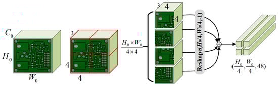 Firstly, the image is input into a dual backbone network called ResSwinT composed of Resnet and Swin Transformer. The multi-scale features obtained by ResSwinT are represented as , where . In the neck, feature enhancement is performed by mixing convolutional layers and Transformer. Due to the various shapes of defects on PCBs, DDTR introduces a spatial attention mechanism to enable the network to adaptively perceive important spatial features. Furthermore, the features extracted by the backbone exhibit high dimensionality in terms of channels. DDTR will emphasize significant channels through channel attention. Ultimately, the same cascade heads used in Cascade R-CNN are employed to enhance the accuracy of PCB defect recognition and detection in the head of DDTR.