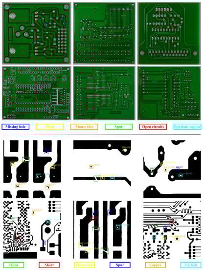 With the emergence of Industry 4.0, production processes have been enhanced by incorporating cyber-physical systems that utilize an increased number of circuit boards to create intelligent systems. To ensure the integrity of the circuit board layout, each element needs to be carefully designed, including the through-holes in the hardware, to guarantee high operational reliability. However, due to process uncertainty and noise, ensuring the integrity of all produced circuit boards becomes challenging. Nevertheless, various machine vision-based methods have been introduced to detect defects. With the upgrading of the PCB production process, the circuit density of PCBs is increasing. The defects generated during the PCB production process exhibit characteristics such as small area, large quantity, and different shapes, requiring PCB defect detection methods to be highly precise and fast. The rapid and widespread adoption of deep learning algorithms has led to the development of numerous deep learning-based techniques in the field of electronic circuits, particularly in identifying flaws in printed circuit boards (PCBs). The primary purpose of a PCB is to provide mechanical support for connecting electronic components, achieved through pads, conductive tracks, and soldering. However, environmental factors make PCB surfaces highly vulnerable to quality issues that deviate from design and manufacturing specifications. For instance, Figure 1 displays six types of PCB defects: spur, mouse bite, spurious copper, missing hole, short circuit, and open circuit. These defects not only significantly affect the quality and performance of final products but also result in substantial economic losses for relevant industries. As a result, detecting flaws on PCB surfaces has become a crucial process in managing PCB production quality, attracting significant attention from the industry.