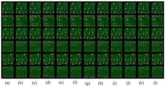 Some visualization results on the PKU-Market-PCB dataset. (a) Input image, (b) ground truth, (c) YOLOv3, (d) SSD, (e) Faster R-CNN_ResNet50, (f) Faster R-CNN_ResNet101, (g) Cascade R-CNN_ResNet50, (h) Cascade R-CNN_ResNet101, (i) Cascade R-CNN_SwinT-T, (j) Cascade R-CNN_SwinT-S, (k) DDTR_ResSwinT-T, (l) DDTR_ResSwinT-S.