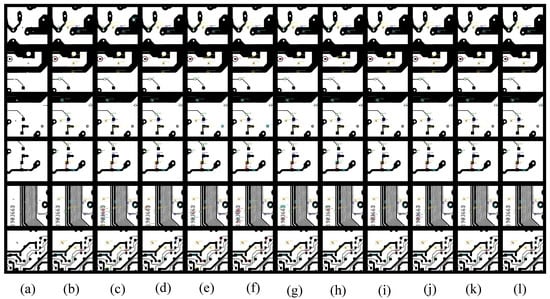Some visualization results on the DeepPCB dataset. (a) Input image, (b) ground truth, (c) YOLOv3, (d) SSD, (e) Faster R-CNN_ResNet50, (f) Faster R-CNN_ResNet101, (g) Cascade R-CNN_ResNet50, (h) Cascade R-CNN_ResNet101, (i) Cascade R-CNN_SwinT-T, (j) Cascade R-CNN_SwinT-S, (k) DDTR_ResSwinT-T, (l) DDTR_ResSwinT-S.