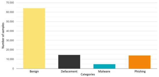 A list of 650,000 URLs, along with their respective categories—phishing, defacement, malware, and benign—was collected from the Kaggle repository (www.kaggle.com, accessed on 26 February 2023). A URL is a unique address identifying a resource, such as an HTML page. A URL consists of several parts, as shown in Figure 2. First, it is planned to specify the protocol that is used to retrieve the object, with HTTPS (encrypted connection) and HTTP (unencrypted) being the most-used protocols. Second, the IP address indicates the web server being requested, and the port indicates the gateway that should be used to access the content. The third part of a URL is the path to the object. The fourth part is a list of parameters that can be used to specify keys and values that allow other actions to be performed. Finally, an anchor allows for jumping to a specific section of the web page. Parameters and anchors may sometimes be excluded from a URL.
