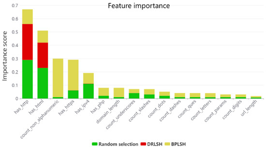 In the next step, the most important features in each dataset were selected using minimum redundancy—maximum relevance (MRMR) [22]. MRMR is designed to select features that not only bear a high correlation with the classification outcome (maximizing relevance) but also exhibit minimal intercorrelation (minimizing redundancy). This dual purpose is achieved using mutual information, a metric quantifying the information shared between variables. In MRMR, mutual information measures the relevance of each feature by calculating its shared information with the target variable and assesses the redundancy between features by examining the shared information between each pair. By maximizing relevance and minimizing redundancy, MRMR results in the selection of highly informative, non-overlapping features. Figure 9 shows the feature importance scores for all 16 features in the datasets. According to Figure 9, the importance scores for random selection and BPLSH are higher than those for DRLSH. Except for the features “has_http” and “has_html”, the scores for DRLSH are less than 0.01. The total importance score for the feature “has_http” in all datasets indicates that it plays the most crucial role in classifying malicious URLs. URLs that use HTTP as a protocol are not encrypted and have a high probability of being malicious.