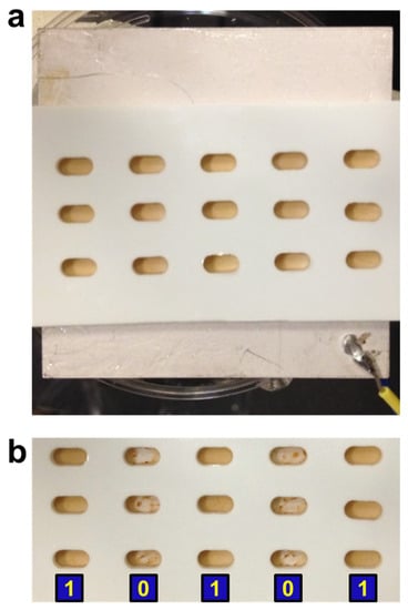 Multiplexed detection using acoustic radiation force. (a) A 15-sample plate placed on a piezo prior to applying ultrasound. (b) The sample plate after applying ultrasound. Each sample well was 4 mm long and 2 mm wide.
