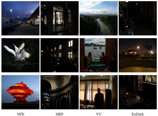 In 2013, Wang et al. [72] introduced the NPE dataset, which comprises two components: a natural image dataset and a low-light image dataset. The natural image dataset consists of a diverse collection of indoor and outdoor scenes captured under normal lighting conditions. In contrast, the low-light image dataset is derived from natural images through specific processing techniques that simulate low-illumination conditions. The low-light image dataset further categorizes the images into two levels: “low” and “high”, which represent different degrees of low-light situations.