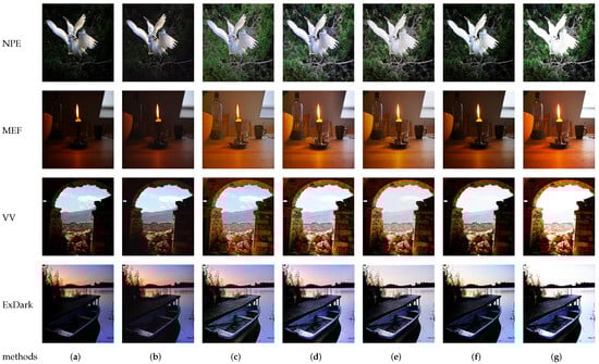 To evaluate and analyze different methods, experiments were conducted using various datasets, including NPE [72], MEF [73], VV, and ExDark [75]. The comparison methods considered in the study included CERL [78], Zero-DCE [39], Zero-DCE++ [45], and SCI [49]. For quantitative analysis, the researchers selected the peak signal-to-noise ratio (PSNR) and structural similarity (SSIM) as evaluation metrics. These metrics were used to measure and analyze the performance of the selected methods. The researchers utilized the pretrained models provided in the original papers for validation and comparison. The comparison results were divided into two main parts: qualitative and quantitative evaluation. Qualitative evaluation involves human perception and judgment of the visual quality of the enhanced images, due to the unique capabilities and sensitivities of the human visual system in image processing and perception. The quantitative evaluation focuses on quantitative metrics, such as the PSNR and SSIM, to provide a more systematic analysis of the performance of the methods. By conducting qualitative and quantitative evaluations, the researchers aimed to comprehensively assess and compare the selected methods by using multiple criteria to elucidate their strengths and weaknesses in enhancing low-light images.