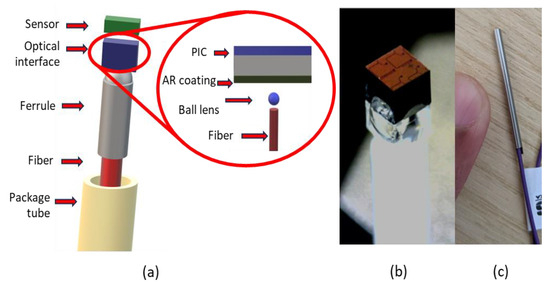 Light in PICs travels in submicrometre-sized waveguides, making it challenging to couple external light (e.g., from/to a fibre) in and out of the PIC. A standard method to interface a PIC with a (single mode) fibre is to use a grating coupler [18,19]. Since the sensor should be in contact with the part to be monitored, the fibre cannot be attached to the surface of the PIC. As such, the PIC should be interfaced from the back side. Moreover, due to the PIC substrate thickness (~720 μm), additional optics are required to focus the spot from the fibre onto the grating coupler. We have developed a method based on a standard microball lens to achieve this in an efficient way, which, also, due to its curvature, collects the backscattering light from the grating coupler into the optical fibre [20]. This solution requires only polishing and (optionally) antireflective coating of the PIC back-side surface, making it suitable for small-scale optical PIC manufacturing. A 3D holder is also utilized for housing the ball lens, which is fabricated in fused silica, using a femtosecond laser for the “drawing” of the required contour and Potassium Hydroxide (KOH) etching of the irradiated parts. The fibre, holder with ball lens, and PIC are precisely mounted on top of each other using a dedicated assembly station and, in a last step, are packaged in a protective metal tube [21]. Figure 2a presents a schematic of the mechanical and optical packaging of the PIC, as well as a schematic of the fibre–chip interface. The temperature sensor can be seen in Figure 2b,c, with the optical PIC on the top side and the optical and mechanical packaging at the bottom side for a sense of scale.