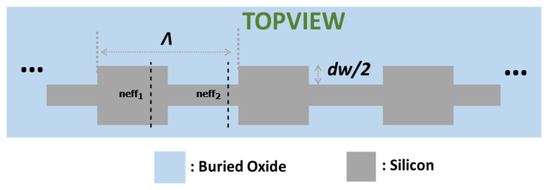The Bragg gratings are surface-relief structures and fabricated on a 220 nm Silicon-on-Insulator platform. A single grating pitch consists of a silicon strip with two different values of width. The materials used and their refractive indices are listed in Table 1.