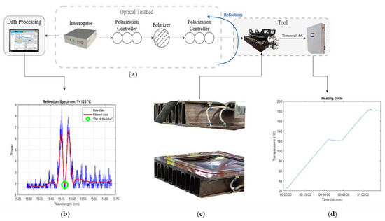 (a) Schematic of the experimental testbed. (b) The response of the optical sensor, raw data (blue) and filtered data (red), with respect to wavelength. (c) Matrix and punch of the composite tool. (d) Heating cycle, as recorded by the thermocouples.