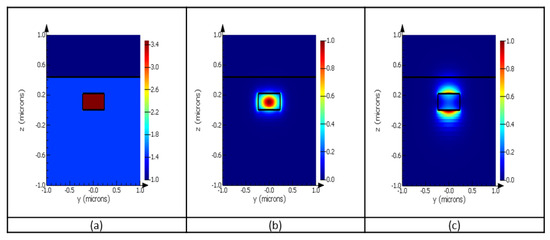 We mentioned in Section 3.1.1 that the starting waveguide width is 450 nm, which is in the range of values for single-mode operation for a wavelength of 1550 nm, while exhibiting low waveguide losses. Figure 6 presents the profile of a structure with a 450 nm width and a height of 215 nm. The field intensity of the two polarization states (TE and TM) can be seen in Figure 6b,c, as well as the refractive index of the materials utilized for the chips (a). We can observe that the electric field is more confined in the silicon core in the TE polarization than in the TM.
